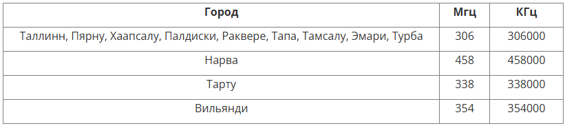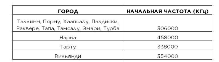 | ГОРОД | НАЧАЛЬНАЯ ЧАСТОТА (МГц) |